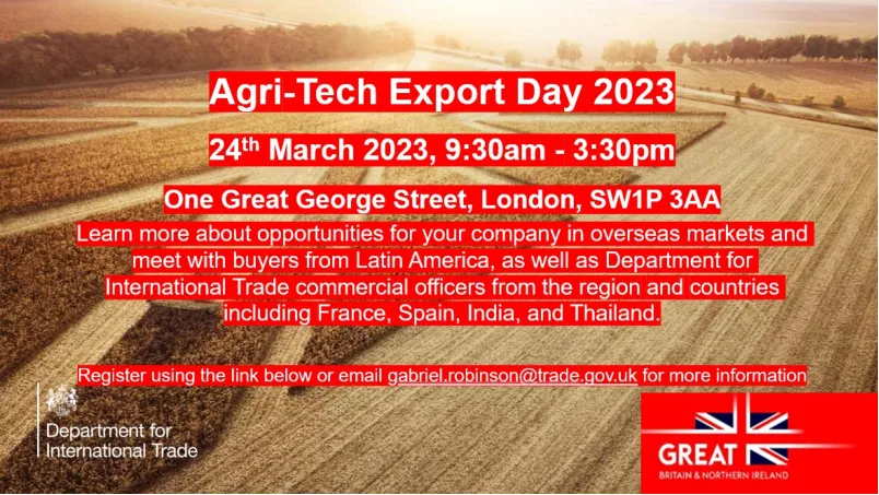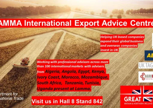 Visit us in Hall 8 Stand 842 LAMMA International Export Advice Centre The Agri-Tech team at the UK Department for International Trade with professional advisors across 100 international markets, and trade