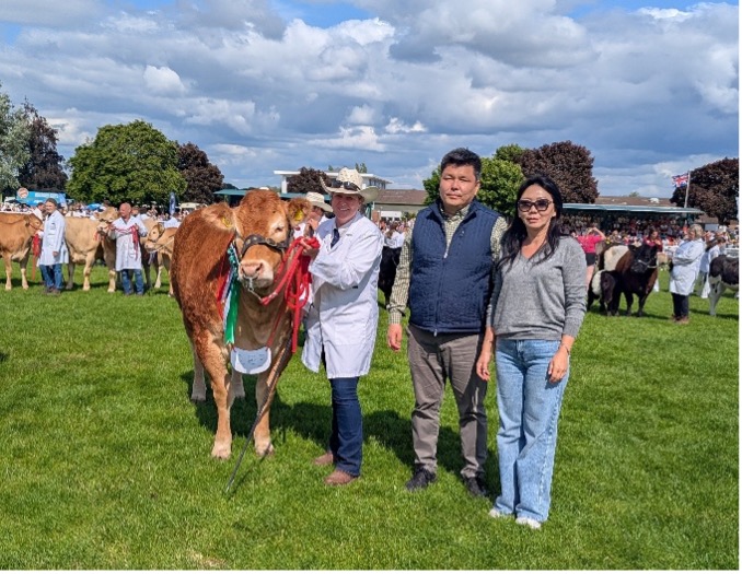 His Excellency the Ambassador for Mongolia and his wife were called forward for photographs with the Champion beef cow, having already presented the ridden hunter champion with his trophy in the morning .